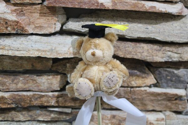 A kis méretű, barna maci talár sapkával így kifejezetten ballagási csokrokba ideális. Kedves megjelenésének köszönhetően remekül beillik csokorba tűzve vagy dekorációként is.