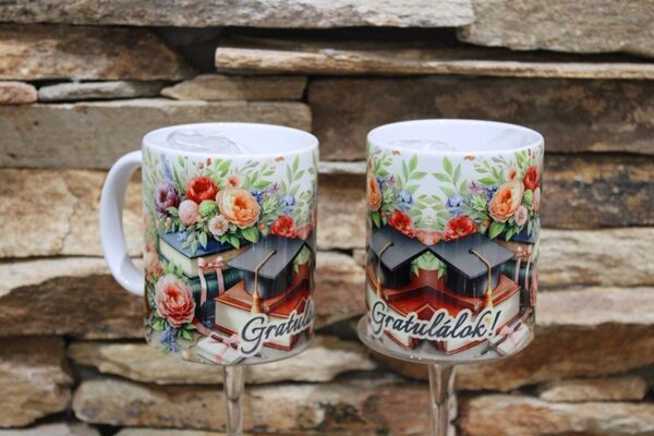 A bögre elegáns grafikáján könyvek, talársapka és gyönyörű virágkompozíció látható, amely a tudást, kitartást és az elért sikert jelképezi. A „Gratulálok!” felirat ünnepélyes és időtálló megjelenést ad, így ideális: