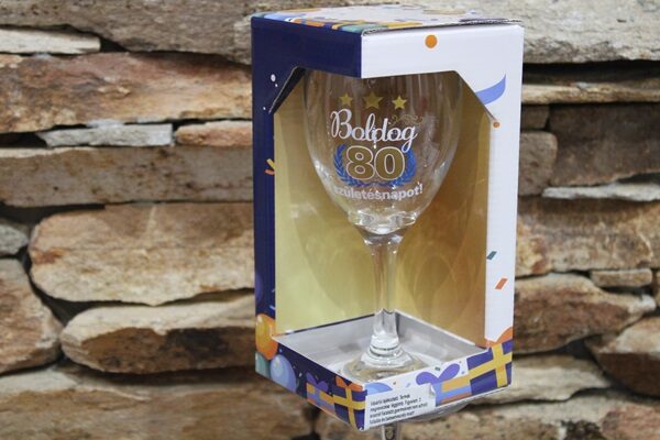 Boldog 80. születésnapot feliratú ajándék borospohár díszdobozban.