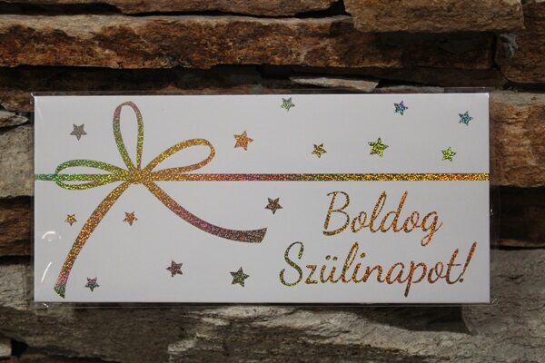A „Boldog Szülinapot!” feliratú díszboríték elegáns, csillogó masnis mintával készült, és felírólapot is tartalmaz, így személyes üzenetet is elhelyezhetsz benne. Tökéletes választás, ha pénzt, ajándékkártyát vagy utalványt szeretnél stílusosan átadni.
