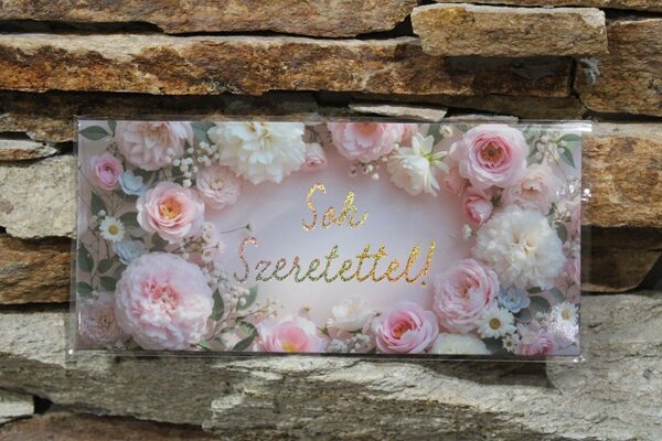 A romantikus, pasztell árnyalatú virágkompozíció és az aranyhatású felirat különleges, ünnepi megjelenést biztosít. A belső díszes felíró lap lehetőséget ad személyes üzenet, jókívánság vagy névre szóló köszöntés írására, így az ajándék még személyesebbé válik.