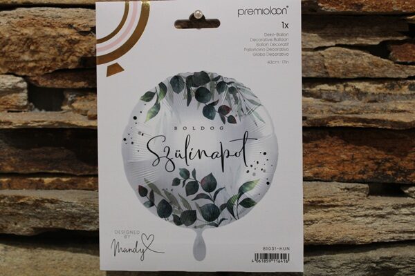 Dobd fel a születésnapi dekorációt ezzel a különleges, elegáns „Boldog Szülinapot” feliratú fólia lufival! A PremoLoon Mandy által tervezett kör alakú lufi gyönyörű zöld leveles mintával díszített, így tökéletes választás modern, letisztult vagy természetközeli stílusú ünneplésekhez.