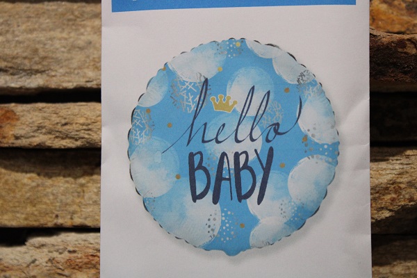 Hello Baby feliratú kék színű kb 45 cm átmérőjű babaváró fólia lufi kis arany koronával díszítve.  Héliummal töltve is kérheted.