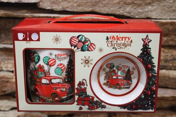 Mesés karácsonyi bögreszett piros autós mintával! 🎁 Tökéletes ajándék bárkinek.