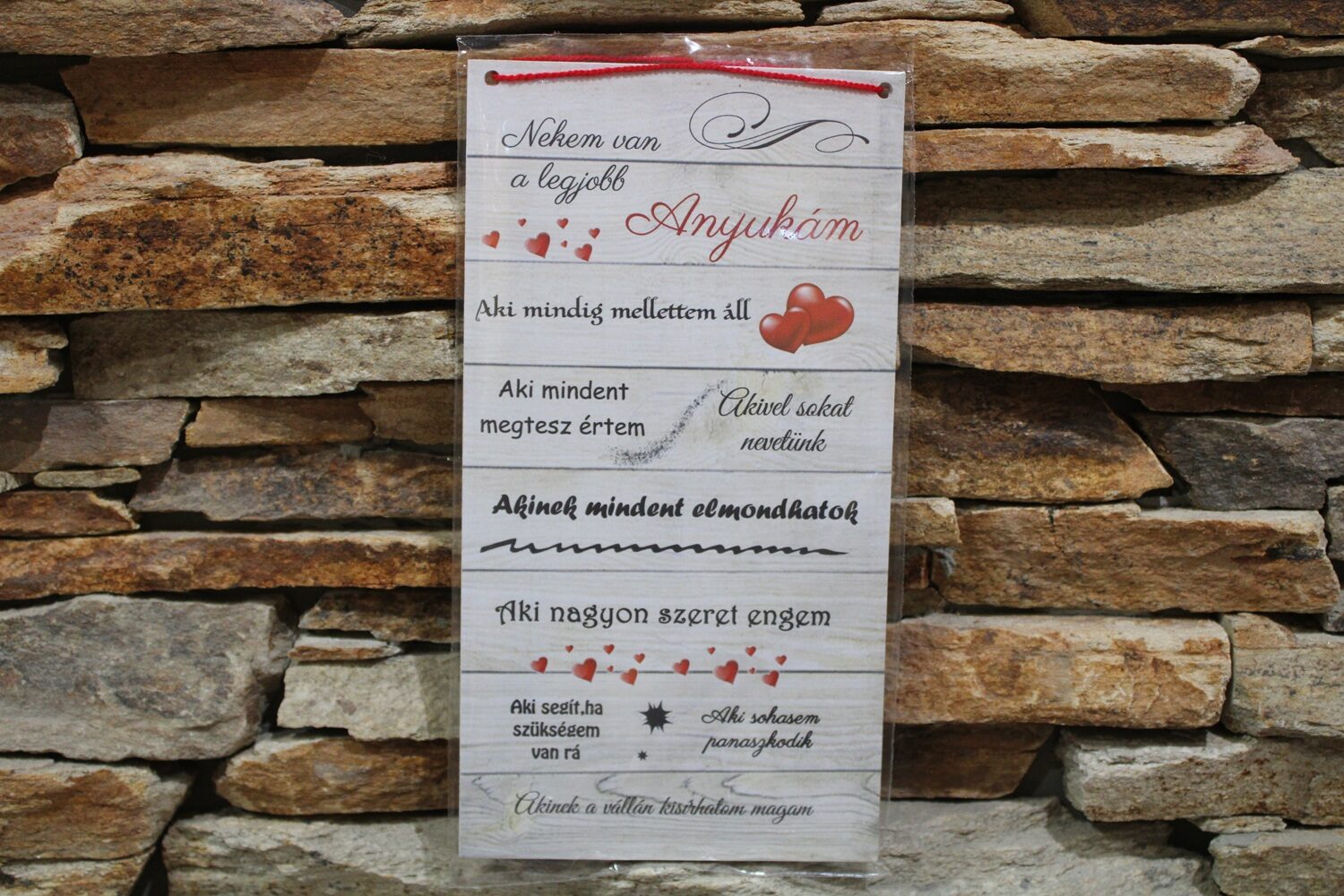 A természetes hatású fa megjelenés és a részletes, kedves szöveg egyedi hangulatot teremt, így ez a dekoráció nemcsak szép, hanem érzelmi értéket is hordoz.