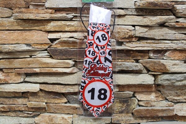 A sebességkorlátozó tábla mintájával és nagy „18” számmal díszített nyakkendő tökéletes ajándék az ünnepeltnek vagy vicces kiegészítő a partyhoz.