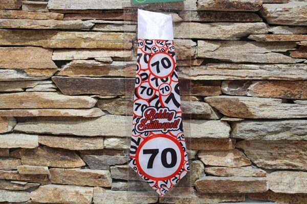 Lepd meg az ünnepeltet egy vidám és egyedi kiegészítővel! Ez a „Boldog születésnapot” feliratú nyakkendő kifejezetten a 70. születésnapra készült, nagy „70” számmal és színes, mintás dizájnnal. Tökéletes választás születésnapi bulikra, családi összejövetelekre vagy vicces ajándékként barátoknak.