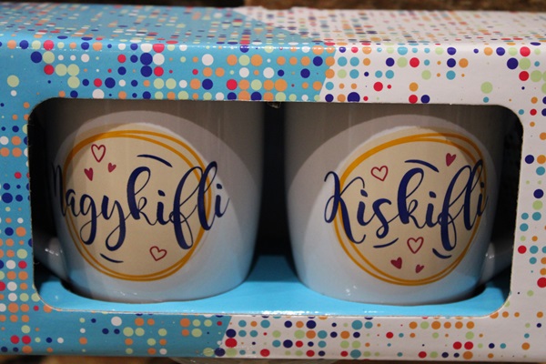 Ajándék páros bögre „kis kifli , nagy kifli ” felirattal.