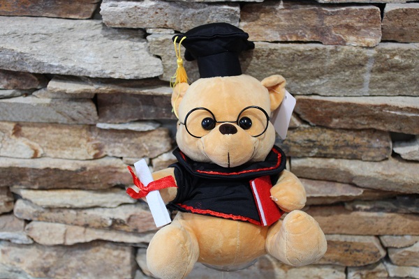 Szemüveges ülő ballagási plüss mackó talárkalappal .