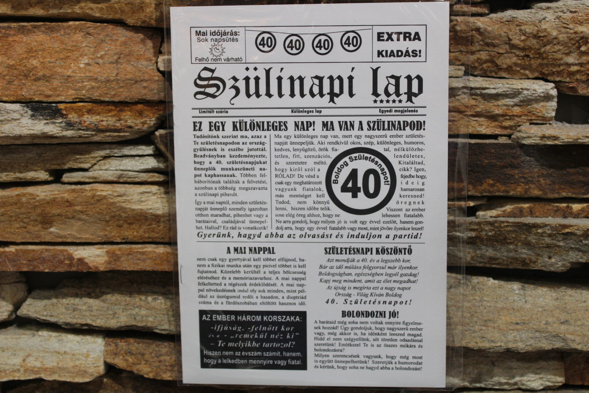 Tele van szórakoztató írásokkal, poénos cikkekkel, születésnapi jókívánságokkal és könnyed humorszövegekkel – tökéletes ajándék minden 40. születésnapot ünneplő számára.