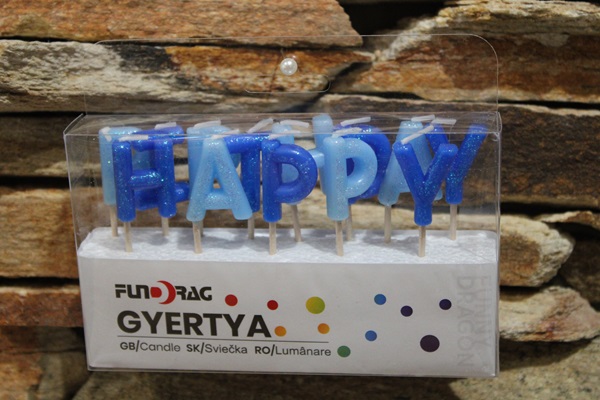 Csillámos kék színű Happy Birthday feliratú tortagyertya,ahol minden betű egy külön gyertya.