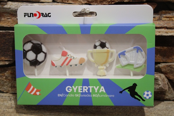 Foci témakörű tortagyertya szett. A szettben 4 db gyertya (focilabda,cipő,serleg,kapu) található.