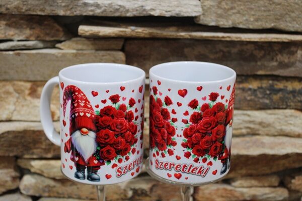 Ez a Valentin napi bögre manóval és vörös rózsákkal igazán különleges, romantikus ajándék, amely egyszerre kedves, mesés és szívhez szóló.