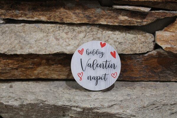 Ez a Valentin-napi hűtőmágnes letisztult, mégis igazán romantikus megjelenésével tökéletes apró ajándék a szerelmesek ünnepére. A természetes hatású háttér, a piros szívecskék és a kedves „Boldog Valentin napot” felirat meghitt, szeretetteljes hangulatot árasztanak.