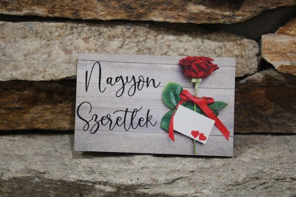 Ez a romantikus Valentin-napi hűtőmágnes letisztult, mégis érzelmekkel teli ajándék, amely tökéletesen fejezi ki a szeretetet. A fa hatású háttéren megjelenő piros rózsa, a kis szívecskés üzenőkártya és a „Nagyon szeretlek” felirat klasszikus, időtálló hangulatot áraszt.