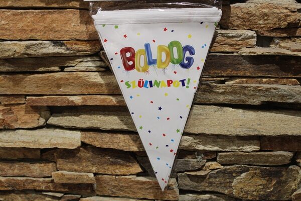 A fehér alapon színes betűk és kis konfettiminták garantálják a játékos, örömteli hangulatot – bármilyen partyhelyszínen könnyedén érvényesül. Egyszerűen felakasztható, kültéren és beltéren is használható, így gyors és látványos megoldást nyújt a díszítéshez.A füzér 12 db zászlóból áll 3 méter hosszban.